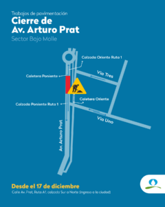 Las obras, consideran la suspensión temporal del tránsito vehicular en la calzada oriente, es decir de sur a norte, de la avenida Arturo Prat (o ruta A-1) entre calle Vía Uno y la rotonda Bajo Molle.