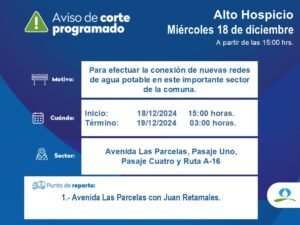 Para realizar la puesta en servicio de una extensión de matriz habilitada en este sector de la comuna, Aguas del Altiplano realizará este miércoles 18 de diciembre una suspensión programada de suministro en avenida Las Parcelas con la ruta A-16 en Alto Hospicio.