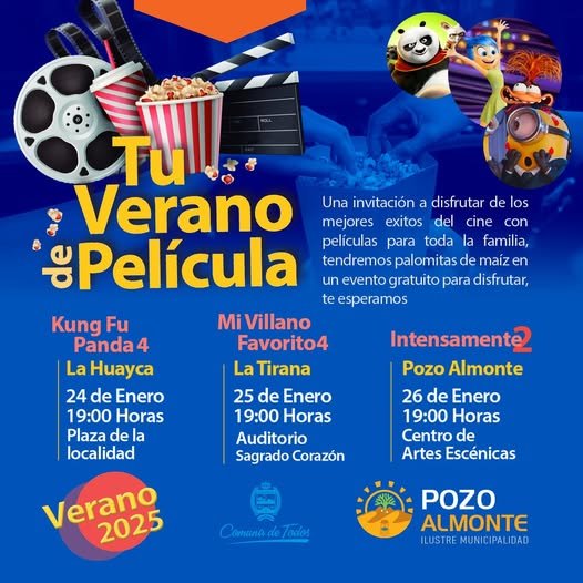 : Kung fu panda 4, Mi villano favorito 4 e Intensamente 2 serán presentadas en el primer ciclo de cine del verano 2025. Mañana comenzamos con La Huayca a partir desde las 19:00hrs, el sábado seguimos con La Tirana, finalizando el domingo en Pozo Almonte. Esperamos a todos los niños …