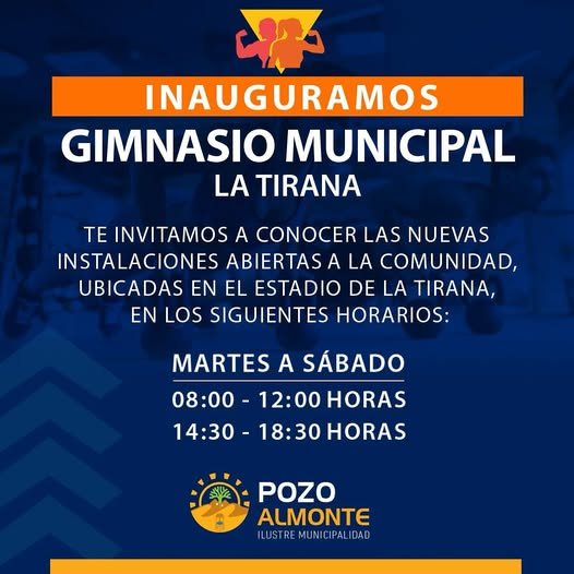 La espera terminó: inauguramos el gimnasio municipal en La Tirana . Abierto de martes a sábados, en los horarios que se indican en el flyer. De acceso totalmente gratuito para toda la comunidad tiraneña, ubicado en el Estadio Municipal . ¡Los y las esperamos, por un 2025 en movimiento! #Gimnasiomunicipal …