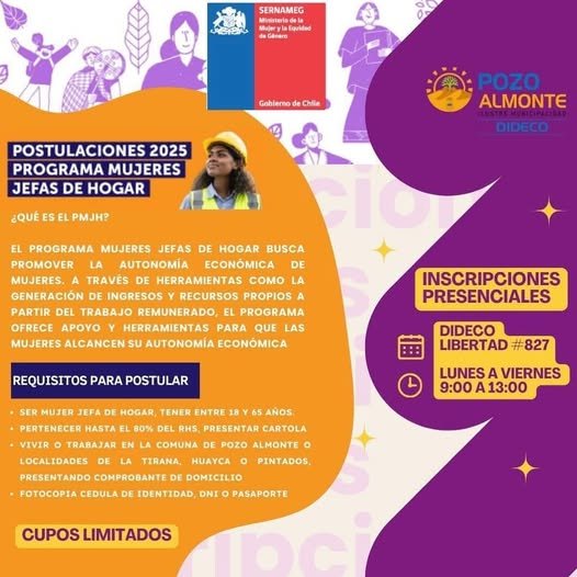 ¡Tenemos una excelente noticia! Les informamos que ya están abiertas las postulaciones para el Programa Mujeres Jefas de Hogar 2025. Si eres una mujer de la comuna de Pozo Almonte, ¡te invitamos a participar! Puedes inscribirte acercándote a las dependencias de DIDECO, en calle Libertad #827 para completar tu inscripción. …