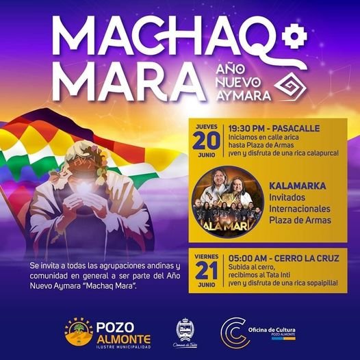 ¡Atención a toda la comunidad! Hoy jueves 20 de junio, celebremos juntos el Machaq Mara. Iniciaremos con un pasacalle a las 19:30 desde la calle Arica hasta la plaza de armas. Al finalizar el pasacalle, disfrutaremos de un espectacular show del grupo Kalamarka. ¡No te lo pierdas! ¡Ven y forma …