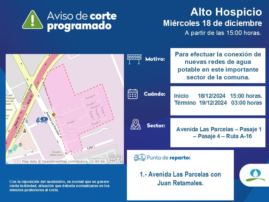 Para realizar la puesta en servicio de una extensión de matriz habilitada en este sector de la comuna, Aguas del Altiplano realizará este miércoles 18 de diciembre una suspensión programada de suministro en avenida Las Parcelas con la ruta A-16 en Alto Hospicio. Según explicó Francisco Montero Lillo, Jefe de …